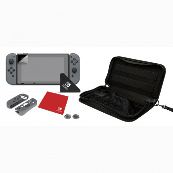 Officially licensed by Nintendo. Soft canvas zipper case to store and protect console. Includes Joy-Con Gel Guards and thumb caps, earbuds, and cleaning cloth. Comes with screen protector and applicator.